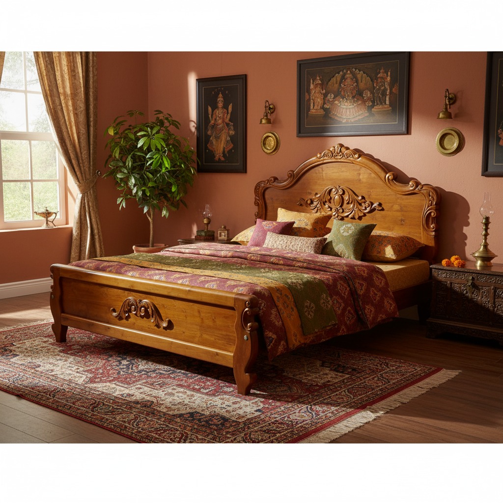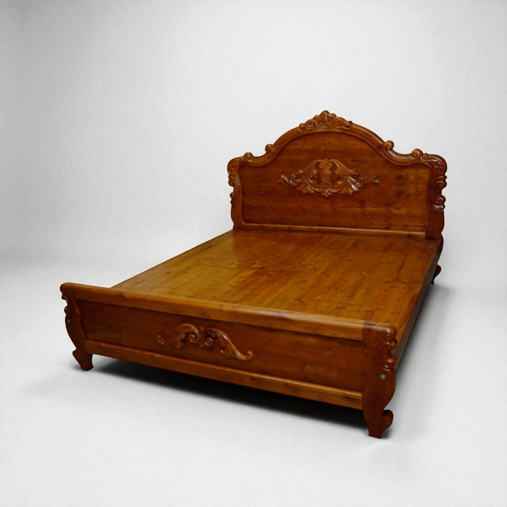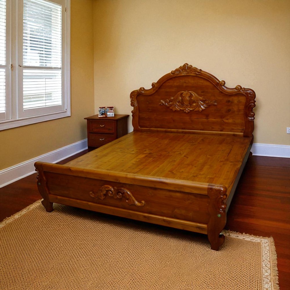 The Rajadhani Carved Bed is a royal elegance and master craftsmanship. Exquisitely crafted from high-grade solid teak wood, this bed features stunning hand-carved ornateness on the headboard and footboard, inspired by classic palace art.