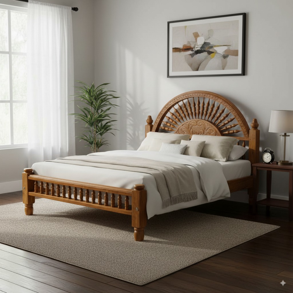 The Chakra Carved Bed, an heirloom-quality work of classic woodworking and spiritual sophistication. Handcrafted from top-grade solid teak wood, this bed features a distinctive sunburst-style arched headboard that evokes the timeless chakra symbol, representing balance, energy, and tranquillity.